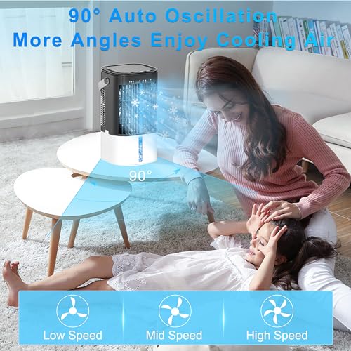 【Mini Aire Acondicionado – Oscilación de 90° 】Admite oscilación automática de 90 °, no es necesario controlar manualmente la dirección del viento, te permite disfrutar del viento refrescante en más ángulos. Perfecto para su hogar, cocina, oficina, etc.