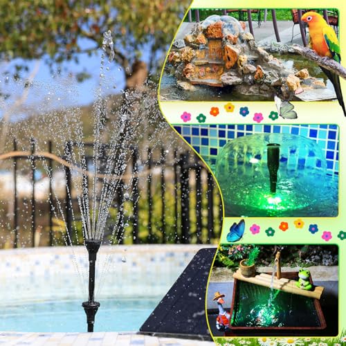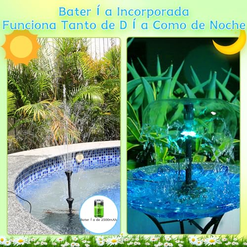 【LED Color&3*2500mAh Batería】Fuente solar tiene tres baterías incorporadas de 2500 mah, que pueden alimentar la fuente durante 6 horas por la noche. Los paneles solares tienen una configuración fotosensible y la luz solar durante el día puede alimentar tanto la batería como la bomba de agua. La batería no funciona durante el día. Si la batería no se usa durante mucho tiempo, estará en modo de sueño y necesitará 10.000 Lux de luz para activarla.