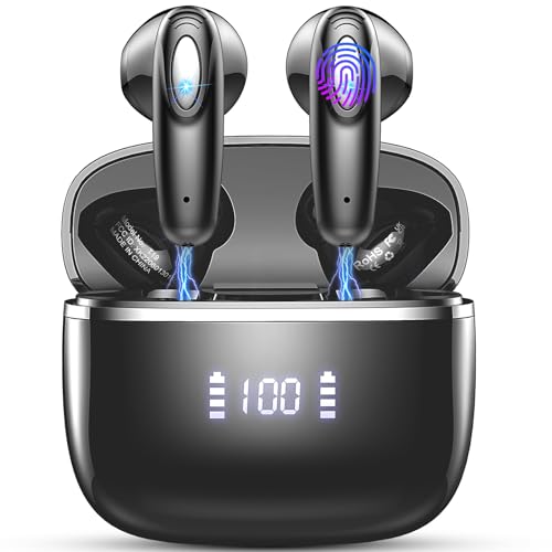 Auriculares Inalambricos Bluetooth, Auriculares Bluetooth 5.3 con 4 HD Mic, 40H Estéreo Hi-Fi, Controlador de 14.2 mm Cascos Inalambricos, IP7 Impermeable, Pantalla LED, Half-In-Ear Auriculares Negro