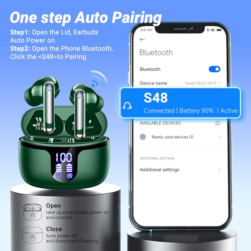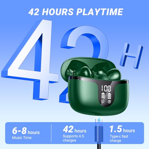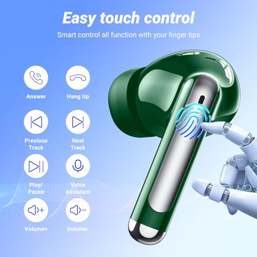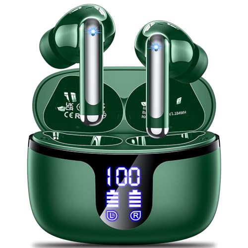 Auriculares Inalámbricos Bluetooth, Auriculares Bluetooth 5.3 Estéreo con 4 ENC Cancelacion Ruido Micró, 42H Control Táctil Cascos Inalambricos, IP7 Impermeable Auriculares in Ear Pantalla LED-Verde