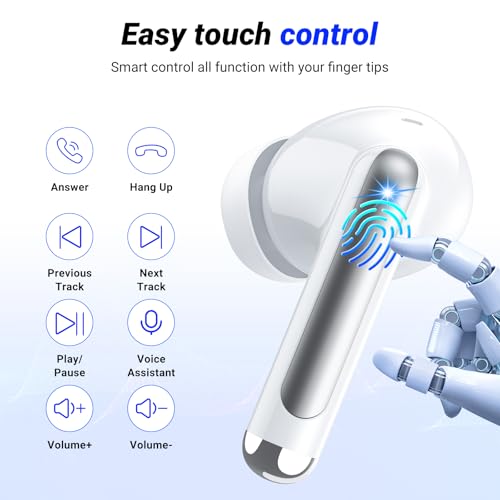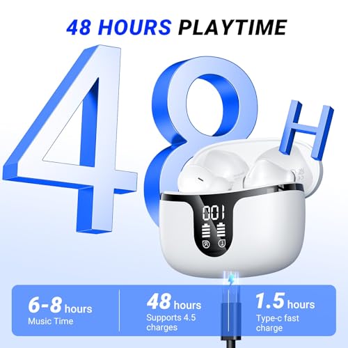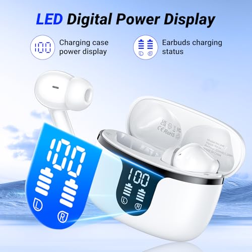 Auriculares Inalámbricos Bluetooth,2024 Cascos Inalámbricos Bluetooth 5.3 HiFi Estéreo con 4 HD Mics, 50H Auriculares Bluetooth con ENC Cancelacion de Ruido,Pantalla LED, IP7 Impermeable USB-C Blanco