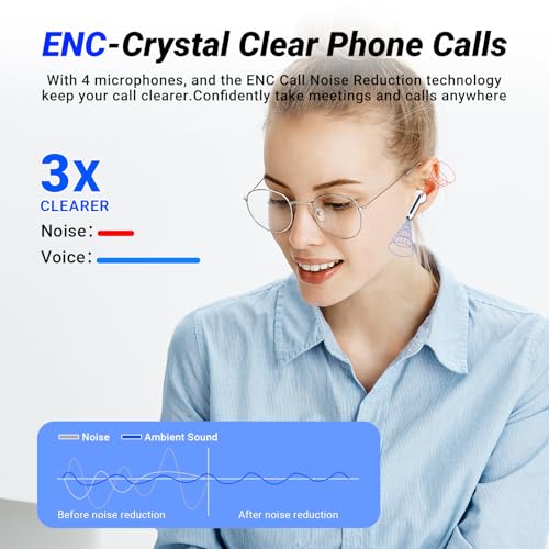 HiFi Estéreo y Cancelación de Ruido ENC: Los auriculares wireless con un controlador dinámico de 13.4 mm y un diafragma de polímero ultrasensible, ofrecen una experiencia de sonido rica en texturas dentro de un amplio campo sonoro. Los auriculares cancelacion ruido de ruido están equipados con micrófonos integrados con tecnología ENC, que captan tu voz con precisión y bloquean el ruido de fondo. Permiten que te escuchen claramente durante llamadas,chats de vídeo, transmisiones en directo etc.