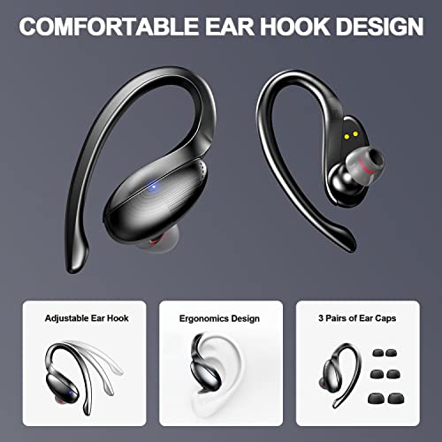 Cómodo Diseño de Gancho para la Oreja Deportivo : Los auriculares bluetooth deportivos utilizan innovadores ganchos de oreja divididos desmontables y un diseño ergonómico para asegúrese de mantenerse cómodo y firme al hacer deportes, correr y otras actividades al aire libre, sin preocuparse de que se caigan los auriculares deporte. Al mismo tiempo, también está equipado con 3 pares de tapones para los oídos de repuesto (L / M / S) para que elijas y obtengas la sensación más adecuada.
