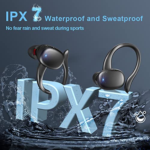 Diseño de Doble Ganchos, Impermeabilidad IP7: auriculares bluetooth deportivos vienen con tres pares tapas de silicona para oídos. el diseño ergonómico y las suaves almohadillas de silicona aseguran que sus auriculares permanezcan seguros y cómodos para un disfrute prolongado. el diseño IP7 resistente al agua y al sudor puede evitar eficazmente que los auriculares running sufran daños causados por las salpicaduras de sudor y gotas de lluvia.