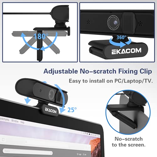 【Rotación de 360 ° y clip de fijación ajustable】: la lente giratoria de 360 grados le permite grabar videos fácilmente desde cualquier ángulo. Con clips de fijación ajustables, se puede fijar en cualquier tipo de computadora, o simplemente se puede colocar en su escritorio o trípode.