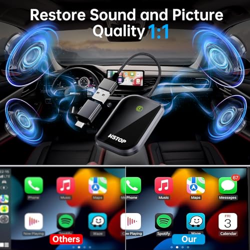 【2024 Adaptador inalámbrico Carplay】HSTOP carplay inalambrico elimina el desorden y los inconvenientes de una conexion por cable y le permite disfrutar de carplay inalambrico en su coche! Este adaptador inalambrico carplay asegura que usted puede seguir utilizando todas las caracteristicas de su carplay, como la navegacion, reproduccion de musica, Siri Assistant, llamadas telefonicas, y mucho mas.