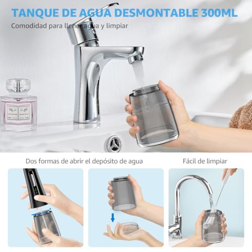 【Tanque de agua de 300 ML & IPX7 Impermeable】Este irrigador dental se actualiza a un tanque de agua extraíble de 300 ml con una bola de gravedad, que proporciona suficiente agua y una limpieza bucal ininterrumpida. 2 opciones de llenado con abertura grande para facilitar el vertido y la limpieza regulares. Diseño impermeable IPX7, limpieza eficaz, se puede utilizar en duchas de baño.
