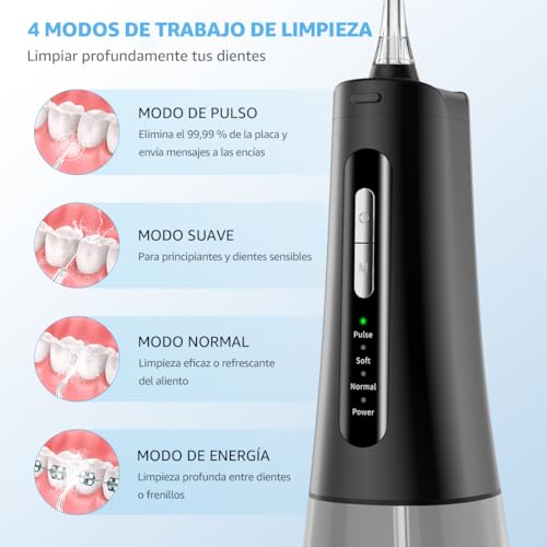 【5 modos & 8 boquillas multifunción】El irrigador bucal tiene 5 modos (fuerte, normal, suave, pulso, niños) para satisfacer sus diferentes condiciones dentales. Incluye 8 boquillas multiusos intercambiables para satisfacer sus necesidades, desde limpieza estándar hasta masaje de encías. La boquilla giratoria de 360° facilita la limpieza de zonas de difícil acceso.