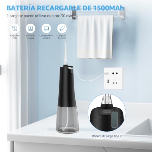 【Batería potente recargable】El Inalambrico Irrigador dental está equipado con una batería potente y respetuosa con el medio ambiente de 1500 mAh, que tarda de 4 a 6 horas en cargarse completamente y se puede utilizar de forma continua durante aproximadamente 21 días. Equipado con cable de datos USB tipo C, adecuado para varios dispositivos de carga, como bancos de energía etc. El diseño inalámbrico hace que sea fácil de usar y guardar mientras viaja, para uso diario en casa o como regalo.