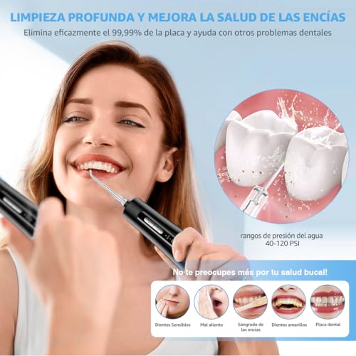 El irrigador dental profesional está equipado con una bomba potente con poco ruido de menos de 55 dB, con una frecuencia de pulso de 1400-1800 veces por minuto y una presión de agua de 30-130 PSI, que puede eliminar eficazmente el 99,99%. De residuos de alimentos y placa dental, manteniendo el aliento fresco, mejora la salud bucal. El irrigador bucal tiene 5 modos (fuerte, normal, suave, pulso, niños) para satisfacer sus diferentes condiciones dentales. Incluye 8 boquillas multiusos intercambiables para satisfacer sus necesidades, desde limpieza estándar hasta masaje de encías. La boquilla giratoria de 360° facilita la limpieza de zonas de difícil acceso. Este irrigador dental se actualiza a un tanque de agua extraíble de 300 ml con una bola de gravedad, que proporciona suficiente agua y una limpieza bucal ininterrumpida. 2 opciones de llenado con abertura grande para facilitar el vertido y la limpieza regulares. Diseño impermeable IPX7, limpieza eficaz, se puede utilizar en duchas de baño. El Inalambrico Irrigador dental está equipado con una batería potente y respetuosa con el medio ambiente de 1500 mAh, que tarda de 4 a 6 horas en cargarse completamente y se puede utilizar de forma continua durante aproximadamente 21 días. Equipado con cable de datos USB tipo C, adecuado para varios dispositivos de carga, como bancos de energía etc. El diseño inalámbrico hace que sea fácil de usar y guardar mientras viaja, para uso diario en casa o como regalo.