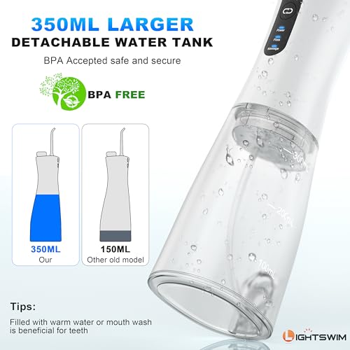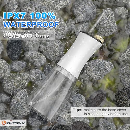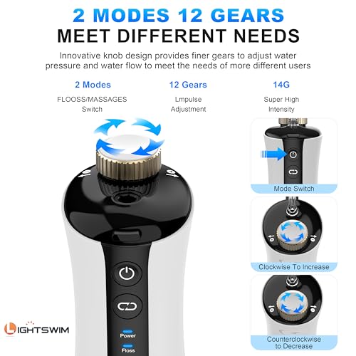 Lightswim Púa dental de agua, hilo dental recargable, 12 engranajes, chorro de agua para aparatos dentales con tanque de agua de 350 ml y 5 puntas de chorro para viajes y uso doméstico (blanco)