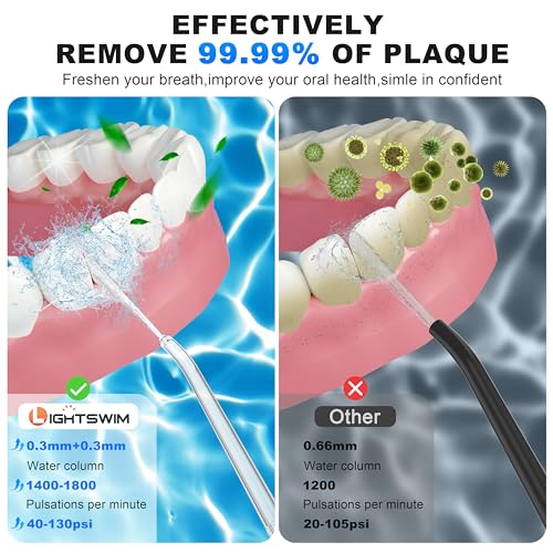 [1500 pulsos por minuto máximo] Tecnología avanzada de pulsos de agua de doble hilo ultrafino de 0,3 mm + 0,3 mm, hasta 130 PSI de presión de agua para limpiar profundamente entre los dientes y debajo del margen gingival. El palillo dental de agua Lightswim ofrece pulsos de alta presión de agua a 1500 veces por minuto, eliminando eficazmente el 99,9 % de la placa dental para una limpieza dental profunda.