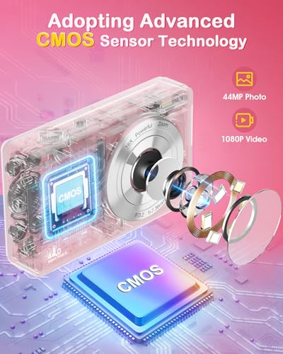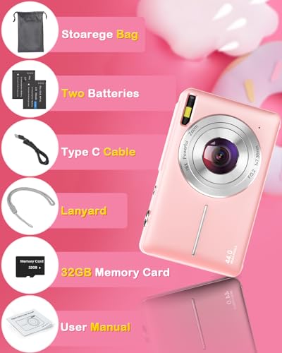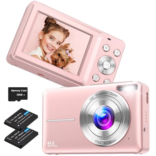 Macchina Fotografica Digitale con Scheda 32GB, 1080P 44MP Cámara Digital con Zoom Digitale 16X Flash e 2 Batterie, Fotocamera Digitale Compatta per Bambini, Adulti, Principianti (Rosa)