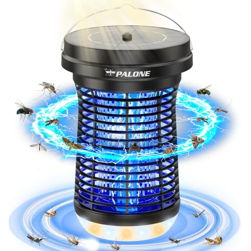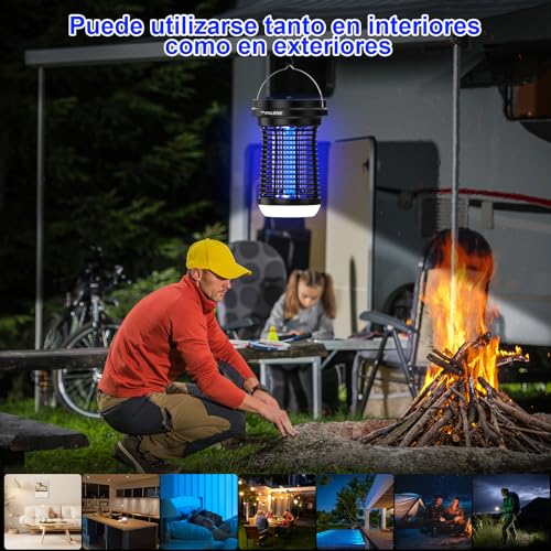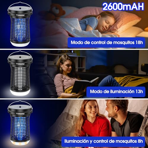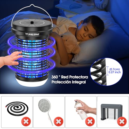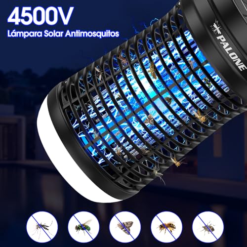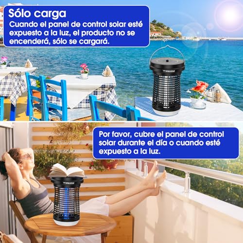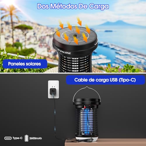 PALONE Lampara Antimosquitos Solar LED Mata Mosquitos Electrico 2600mAh/4500V Recargable USB C con Panel Solar de 3.5W/5V y Cable de 3.5M y Cable de Carga Tipo-C de 1M para Uso Exterior