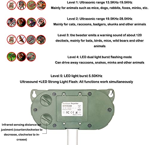 ✔ Carga USB y energía solar: Hay un panel solar en la cabeza del búho. Deje que el búho absorba la energía cuando hace sol. Además, viene con una batería de litio recargable de 500 mAh. También puede cargar el repelente ultrasónico a través de la alimentación USB. 5 MODOS AJUSTABLES La frecuencia irregular y variable hace que sea más efectivo ahuyentar a los animales más agresivos que pueden adaptarse y volverse inmunes a una banda de frecuencia en particular.