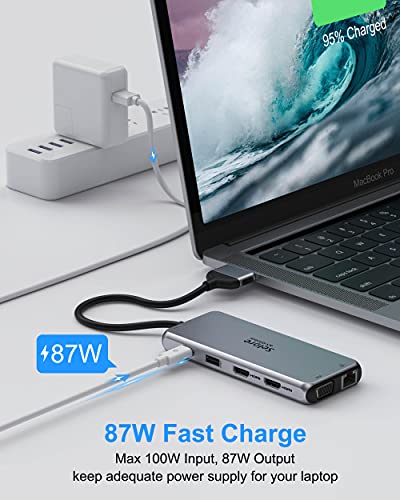 Docking Station USB C. Este es un adaptador USB-C multifuncional de aleación. extiende principalmente la interfaz USB-C de la fuente dispositivo a HDMI, VGA, interfaz de red RJ45, USB3.0, USB2.0, lector de tarjetas SD / Micro SD, 3,5 mm Puerto de carga de audio / micrófono y USB-C. Tiene puerto dual-in-USB-C, especialmente utilizado para MacBook y logre la pantalla Multi-Stream de MacBook (Extienda 2 pantallas diferentes en 2 pantallas externas).