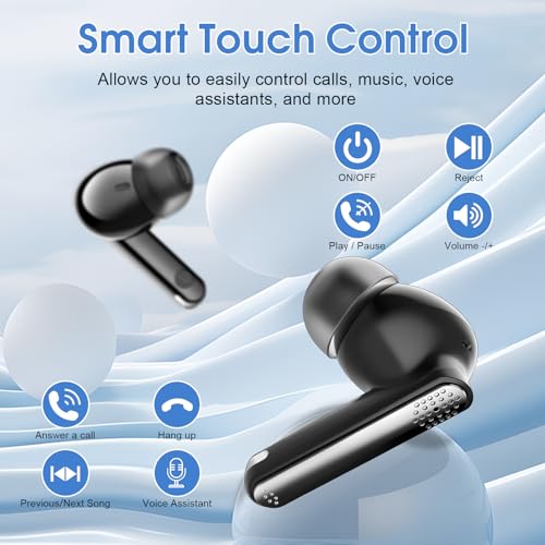 Control táctil y amplia compatibilidad: Con un chip táctil de alta precisión, los auriculares Bluetooth inalámbricos permiten tocar para responder llamadas, colgar, reproducir/pausar música, ajustar el volumen y activar el asistente de voz. Los auriculares intrauditivos pueden conectarse a la mayoría de los dispositivos compatibles con Bluetooth en el mercado, ofreciendo comodidad y versatilidad.
